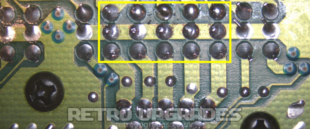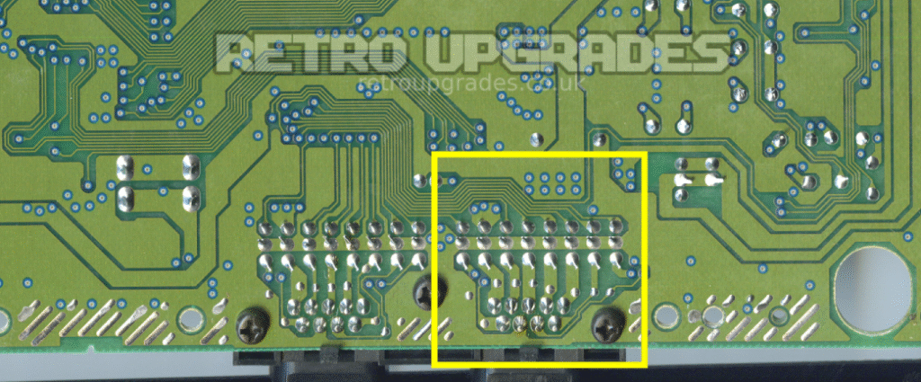 The 3 x 5 row of pins for ‘controller port 1’ highlighted above that sit under the MDIGR board once assembled need trimming so that the MDIGR board will lay flat once installed.