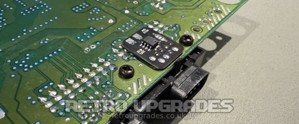 Align the 9 pins on the MDIGR board with the 9 pins on ‘controller port 1’. Solder the MDIGR board in place.