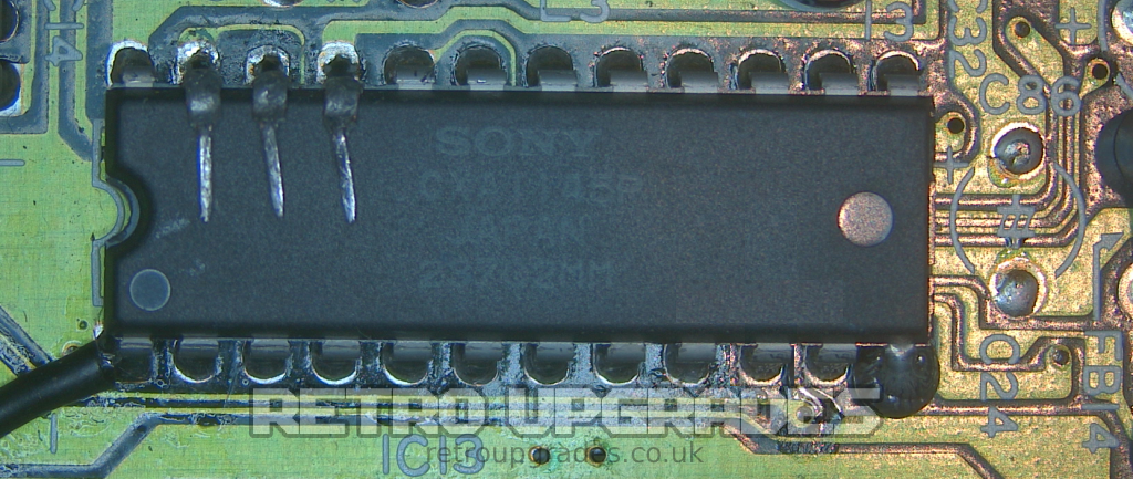 Locate the RGB encoder chip, which for the PAL VA4 board is ‘IC13’. Other revisions may have the chip oriented differently. The circle on the chip indicates pin 1.